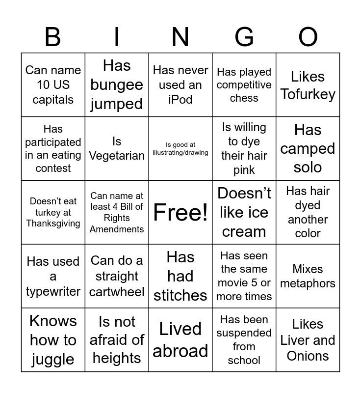 This bingo card has a free space and 142 words: Goes by a nickname, Is a Diet Soda addict, Can’t swim, Can knit or crochet, Has a Justin Beiber song on their play list, Has seen the same movie 5 or more times, Belongs to a Book Club, Still knows their high school song, Can’t ride a bike, Has never seen “Rocky Horror Picture Show”, Has 3 or more siblings, Has friends or family who live in another Continent, Can play 2 or more instruments, Was a camp counselor, Flunked first driving test, Loves road trips, Follows Monopoly rules, Has never stayed overnight in a hospital, Sleeps 5 or less hours per night, Can whistle a tune in key, Is allergic to cats, Mixes metaphors, Can dance the Macarena or Gangum Style, Has never seen Titanic, Is left-handed, Can name at least 4 Bill of Rights Amendments, Has bungee jumped, Hard drive is full of animae, Who can name all the movies in the Star Wars Trilogy?, Rides a motorcycle, Can name all 7 dwarves from Snow White, Has seen a (wild) bear in the woods, Used to breakdance, Has hair dyed another color, Doesn’t have a Facebook account, Had surgery in the last year, Has their childhood Dr. Seuss books, Has visited all 50 states, Is willing to dye their hair pink, Prefers Snowboarding over skiing, Played in a band, Owns a yoga mat (and uses it!), Has had stitches, Was born in the same year, Has used a card catalog at a library, Grew up on a real farm, Has never had a cavity, Likes pineapple on pizza, Has walked across the Golden Gate Bridge, Washes their own car, Has acted in a play, Meditates regularly, Knows how to juggle, Knows how to code, Read more than 20 books this year, Has met their doppleganger, Had a goldfish as a kid, Has met someone famous, Has the same color eyes as yourself, Has been on a blind date, Visited Washington DC, Has been suspended from school, Loves changing up their home wall colors often, Prefers campsites over a hotel, Has been on four or more continents, Has used a typewriter, Has won more than $1k in lottery, Is an early bird on the weekends, Seen a broadway show, Has their name often mispronounced (first or last), Speaks more than two languages, Can name 10 US capitals, Doesn’t eat turkey at Thanksgiving, Has shaken hands with a US President, Knows how to do origami, Has naturally curly hair, Still subscribes to an actual newspaper, Exercised daily, Has played competitive chess, Is crafty, Has been a teacher (of any kind), Has never read a book for fun, Knows how to surf, Has backpacked abroad, Has camped solo, Is a night owl, Doesn’t like ice cream, Loves line dancing, Lived abroad, Flosses twice a day religiously, Can't roll their tongue, Can recite a line from Shakespeare, Has never played Monopoly or Twister, Is not afraid of heights, Reads cookbooks, Is the youngest child, Can’t program electronics, Matches their purse and shoes, Grows herbs, Has been in the military, Has participated in an eating contest, Has never had Starbuck's coffee, Milked a cow, Knows the answer to all the times tables, Is good at illustrating/drawing, Completed an escape room, Has slept on the beach overnight, Has cried in public, Puts ketchup on most of their food, Can do a straight cartwheel, Can speak 3 or more foreign languages, Has visited every state in the U.S, Likes Tofurkey, Likes Liver and Onions, Can name all 50 states, Is Vegetarian, Has never used a rotary phone, Plays the bongos, Plays Bridge, Is a neat freak, Loves coffee houses, Uses big words frequently, Has never received a speeding ticket, Has been in a parade, Likes very spicy food, Never walks under ladders, Cuts their own hair, Sings in a choir, Can or has lasso'd a steer, Can name at least two countries in Africa, Can recite the preamble of the Constitution, Has been on a game show, Has hitchhiked, Kills houseplants, Owns a snake, Has 4 or more TVs at home, Has attended over 5 live concerts, Has never used an iPod, Has played Pokemon, Loves writing in cursive, Has never caught a fish and Gets upset over roadkill.