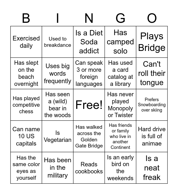 This bingo card has a free space and 142 words: Belongs to a Book Club, Still knows their high school song, Can’t ride a bike, Has never seen “Rocky Horror Picture Show”, Has 3 or more siblings, Has friends or family who live in another Continent, Can play 2 or more instruments, Was a camp counselor, Flunked first driving test, Loves road trips, Follows Monopoly rules, Has never stayed overnight in a hospital, Sleeps 5 or less hours per night, Can whistle a tune in key, Is allergic to cats, Mixes metaphors, Can dance the Macarena or Gangum Style, Has never seen Titanic, Is left-handed, Can name at least 4 Bill of Rights Amendments, Has bungee jumped, Hard drive is full of animae, Who can name all the movies in the Star Wars Trilogy?, Rides a motorcycle, Can name all 7 dwarves from Snow White, Has seen a (wild) bear in the woods, Used to breakdance, Has hair dyed another color, Doesn’t have a Facebook account, Had surgery in the last year, Has their childhood Dr. Seuss books, Has visited all 50 states, Is willing to dye their hair pink, Prefers Snowboarding over skiing, Played in a band, Owns a yoga mat (and uses it!), Has had stitches, Was born in the same year, Has used a card catalog at a library, Grew up on a real farm, Has never had a cavity, Likes pineapple on pizza, Has walked across the Golden Gate Bridge, Washes their own car, Has acted in a play, Meditates regularly, Knows how to juggle, Knows how to code, Read more than 20 books this year, Has met their doppleganger, Had a goldfish as a kid, Has met someone famous, Has the same color eyes as yourself, Has been on a blind date, Visited Washington DC, Has been suspended from school, Loves changing up their home wall colors often, Prefers campsites over a hotel, Has been on four or more continents, Has used a typewriter, Has won more than $1k in lottery, Is an early bird on the weekends, Seen a broadway show, Has their name often mispronounced (first or last), Speaks more than two languages, Can name 10 US capitals, Doesn’t eat turkey at Thanksgiving, Has shaken hands with a US President, Knows how to do origami, Has naturally curly hair, Still subscribes to an actual newspaper, Exercised daily, Has played competitive chess, Is crafty, Has been a teacher (of any kind), Has never read a book for fun, Knows how to surf, Has backpacked abroad, Has camped solo, Is a night owl, Doesn’t like ice cream, Loves line dancing, Lived abroad, Flosses twice a day religiously, Can't roll their tongue, Can recite a line from Shakespeare, Has never played Monopoly or Twister, Is not afraid of heights, Reads cookbooks, Is the youngest child, Can’t program electronics, Matches their purse and shoes, Grows herbs, Has been in the military, Has participated in an eating contest, Has never had Starbuck's coffee, Milked a cow, Knows the answer to all the times tables, Is good at illustrating/drawing, Completed an escape room, Has slept on the beach overnight, Has cried in public, Puts ketchup on most of their food, Can do a straight cartwheel, Can speak 3 or more foreign languages, Has visited every state in the U.S, Likes Tofurkey, Likes Liver and Onions, Can name all 50 states, Is Vegetarian, Has never used a rotary phone, Plays the bongos, Plays Bridge, Is a neat freak, Loves coffee houses, Uses big words frequently, Has never received a speeding ticket, Has been in a parade, Likes very spicy food, Never walks under ladders, Cuts their own hair, Sings in a choir, Can or has lasso'd a steer, Can name at least two countries in Africa, Can recite the preamble of the Constitution, Has been on a game show, Has hitchhiked, Kills houseplants, Owns a snake, Has 4 or more TVs at home, Has attended over 5 live concerts, Has never used an iPod, Has played Pokemon, Loves writing in cursive, Has never caught a fish, Gets upset over roadkill, Goes by a nickname, Is a Diet Soda addict, Can’t swim, Can knit or crochet, Has a Justin Beiber song on their play list and Has seen the same movie 5 or more times.