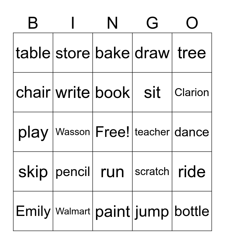 This bingo card has a free space and 24 words: pencil, Walmart, book, Emily, tree, table, chair, store, teacher, run, sit, play, scratch, ride, write, jump, dance, bake, Clarion, Wasson, bottle, skip, draw and paint.