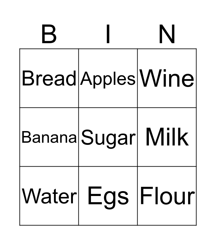 This bingo card has 9 words: Water, Wine, Apples, Banana, Bread, Milk, Sugar, Flour and Egs.