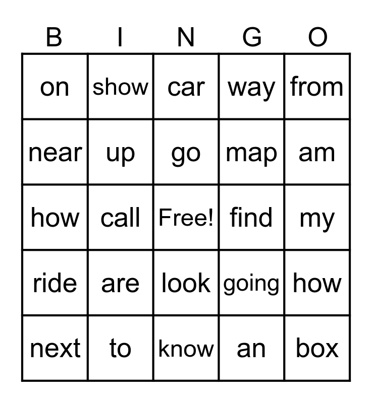 This bingo card has a free space and 24 words: are, to, go, next, from, on, near, show, find, look, map, how, going, how, up, an, my, car, am, call, box, ride, way and know.