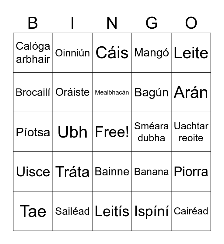 This bingo card has a free space and 47 words: Tornapa, Cairéad, Cabáiste, Leitís, Tráta, Práta, Oinniún, Piobar, Brocailí, Cóilis, Oráiste, Mangó, Piorra, Banana, Fíonchaora, Sú talún, Mealbhacán, Sméara dubha, Sméara gorma, Leite, Ubh, Ispíní, Calóga arbhair, Bagún, Pancóga, Arán, Tae, Caife, Bainne, Uisce, Sú oráiste, Sú úll, Seacláid the, Sceallóga, Cáca, Sailéad, Uachtar reoite, Borgaire, Sicín, Stéig, Piseanna, Cáis, Píotsa, Anraith, Spaigití, Salann and Piobar.