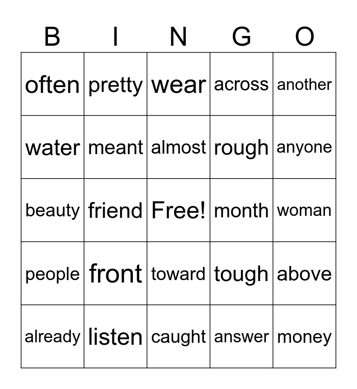 This bingo card has a free space and 28 words: above, women, rough, answer, water, wear, pretty, people, month, already, beauty, across, listen, caught, anyone, bought, front, meant, almost, toward, often, around, money, friend, woman, tough, another and beautiful.