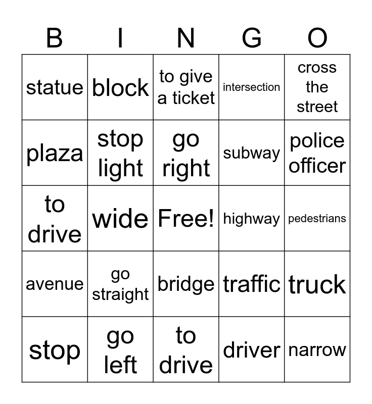 This bingo card has a free space and 24 words: go straight, go left, go right, stop, cross the street, statue, plaza, block, highway, bridge, subway, to drive, traffic, truck, stop light, driver, pedestrians, to give a ticket, police officer, wide, narrow, avenue, intersection and to drive.