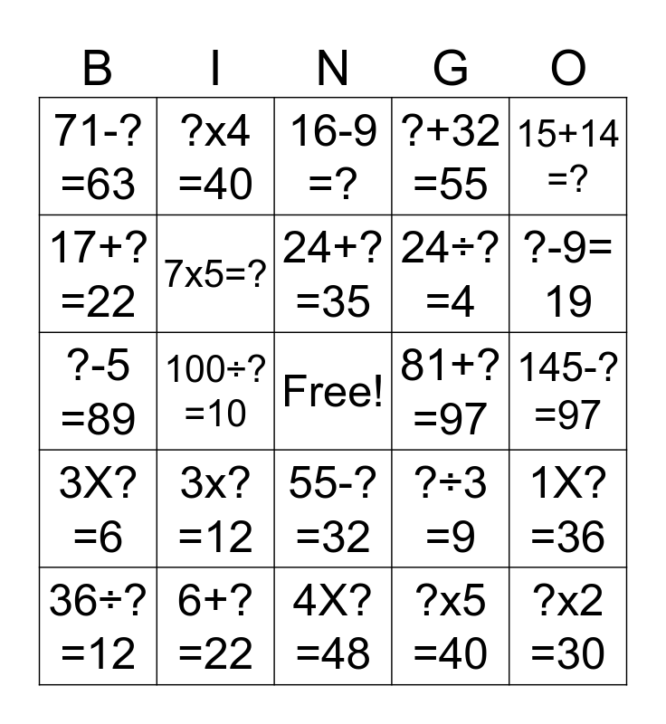 This bingo card has a free space and 25 words: 36÷?=12, 3x?=12, 24+?=35, ?x5 =40, ?-9= 19, 71-?=63, ?x4 =40, 16-9 =?, 24÷?=4, 1X?=36, ?-5 =89, 7x5=?, ?÷3 =9, ?x2 =30, 17+?=22, 6+?=22, 4X? =48, ?+32 =55, 145-?=97, 3X?=6, 100÷?=10, 55-?=32, 81+?=97, 15+14 =? and 3X?=6.