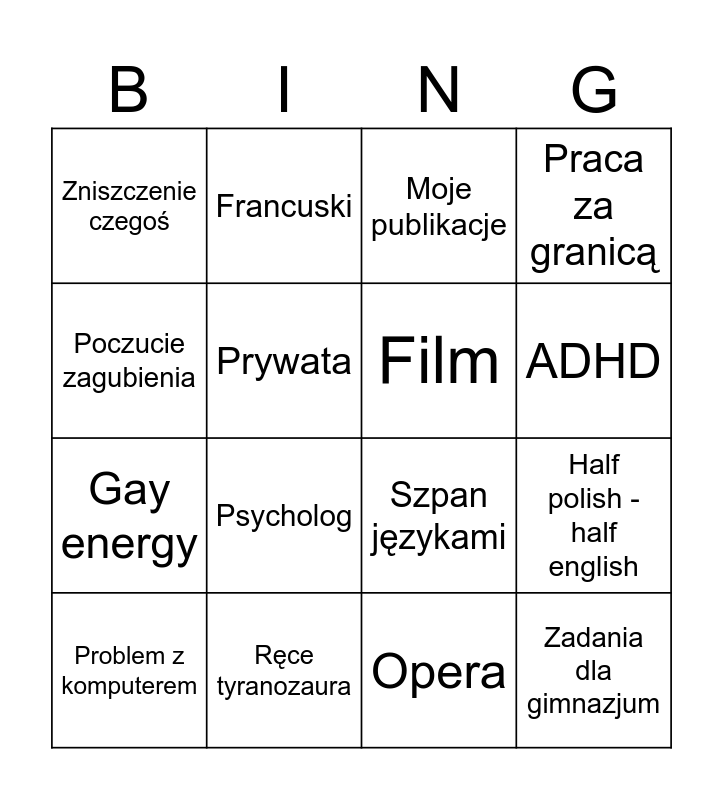 This bingo card has 16 words: Ręce tyranozaura, Half polish - half english, Moje publikacje, Zniszczenie czegoś, Gay energy, Francuski, Szpan językami, Opera, Poczucie zagubienia, Prywata, Problem z komputerem, Praca za granicą, Psycholog, ADHD, Film and Zadania dla gimnazjum.