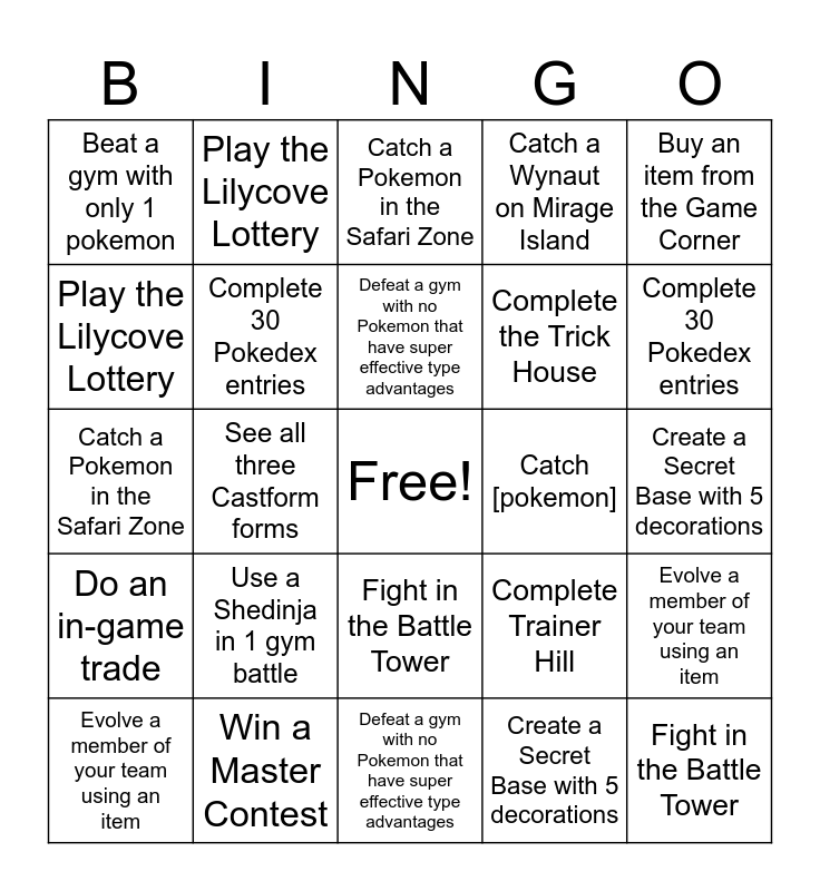 ⚠ This card has duplicate items: Catch [pokemon] (2), Beat a gym with only 1 pokemon (2), Win a Master Contest (2), Complete 30 Pokedex entries (2), Evolve a member of your team using an item (2), Use a Shedinja in 1 gym battle (2), Defeat a gym with no Pokemon that have super effective type advantages (2), Catch a Legendary (2), Buy an item from the Game Corner (2), Complete the Trick House (2), See all three Castform forms (2), Catch a Wynaut on Mirage Island (2), Fight in the Battle Tower (2), Create a Secret Base with 5 decorations (2), Play the Lilycove Lottery (2), Do an in-game trade (2), Complete Trainer Hill (2), Catch a Pokemon in the Safari Zone (2), Breed a Pokemon (2)
