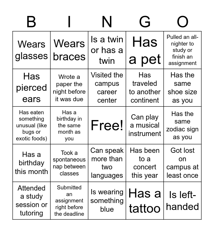 This bingo card has a free space and 24 words: Took a spontaneous nap between classes, Submitted an assignment right before the deadline, Visited the campus career center, Attended a study session or tutoring, Pulled an all-nighter to study or finish an assignment, Wears glasses, Has pierced ears, Wears braces, Can play a musical instrument, Can speak more than two languages, Has traveled to another continent, Has eaten something unusual (like bugs or exotic foods), Has been to a concert this year, Got lost on campus at least once, Wrote a paper the night before it was due, Has a tattoo, Has the same zodiac sign as you, Is a twin or has a twin, Has the same shoe size as you, Has a birthday in the same month as you, Is left-handed, Has a birthday this month, Has a pet and Is wearing something blue.