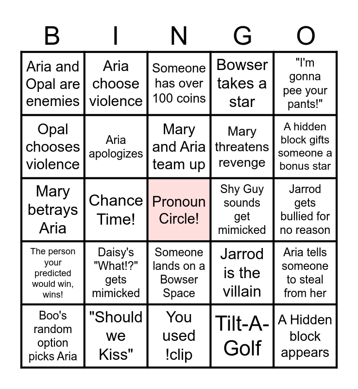 This bingo card has a free space and 26 words: Someone lands on a Bowser Space, Tilt-A-Golf, Mary and Aria team up, "Should we Kiss", "I'm gonna pee your pants!", Aria and Opal are enemies, Opal chooses violence, Aria choose violence, Jarrod gets bullied for no reason, Jarrod is the villain, Mary threatens revenge, Mary betrays Aria, Aria tells someone to steal from her, Boo's random option picks Aria, Chance Time!, Aria manifests a roll, Bowser takes a star, The person your predicted would win, wins!, Someone has over 100 coins, A Hidden block appears, A hidden block gifts someone a bonus star, You used !clip, Shy Guy sounds get mimicked, Daisy's "What!?" gets mimicked, Aria apologizes and Opal throws Aria under the bus.