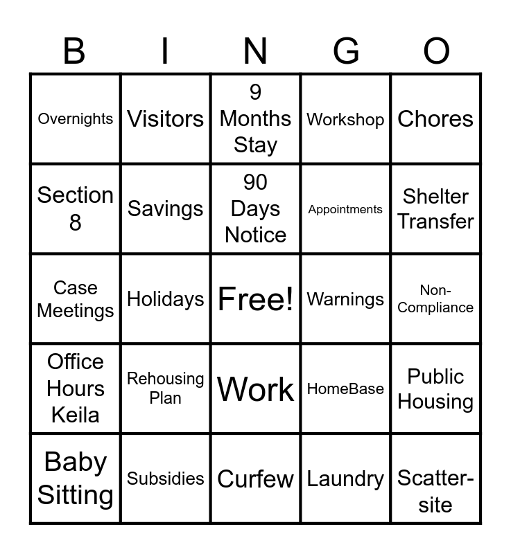 This bingo card has a free space and 24 words: Baby Sitting, Rehousing Plan, 90 Days Notice, Laundry, Chores, Overnights, Visitors, 9 Months Stay, Warnings, Non-Compliance, Case Meetings, Savings, HomeBase, Public Housing, Section 8, Subsidies, Curfew, Workshop, Shelter Transfer, Office Hours Keila, Holidays, Work, Appointments and Scatter-site.