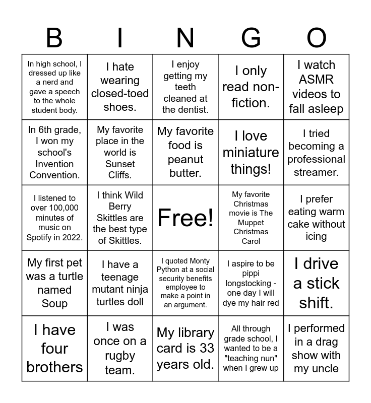 This bingo card has a free space and 24 words: I have a teenage mutant ninja turtles doll, I was once on a rugby team., My favorite food is peanut butter., I have four brothers, I watch ASMR videos to fall asleep, In high school, I dressed up like a nerd and gave a speech to the whole student body., In 6th grade, I won my school's Invention Convention., I hate wearing closed-toed shoes., My favorite Christmas movie is The Muppet Christmas Carol, I quoted Monty Python at a social security benefits employee to make a point in an argument., I love miniature things!, I listened to over 100,000 minutes of music on Spotify in 2022., I aspire to be pippi longstocking - one day I will dye my hair red, I drive a stick shift., My favorite place in the world is Sunset Cliffs., All through grade school, I wanted to be a "teaching nun" when I grew up, I prefer eating warm cake without icing, I enjoy getting my teeth cleaned at the dentist., I tried becoming a professional streamer., I think Wild Berry Skittles are the best type of Skittles., I performed in a drag show with my uncle, My first pet was a turtle named Soup, I only read non-fiction. and My library card is 33 years old..
