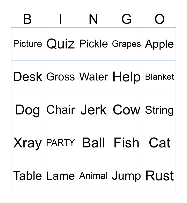 This bingo card has 25 words: PARTY, Animal, Water, Table, Apple, Picture, Desk, Quiz, Cow, Ball, Help, Dog, Fish, Cat, Gross, Rust, String, Pickle, Blanket, Chair, Jerk, Lame, Xray, Grapes and Jump.