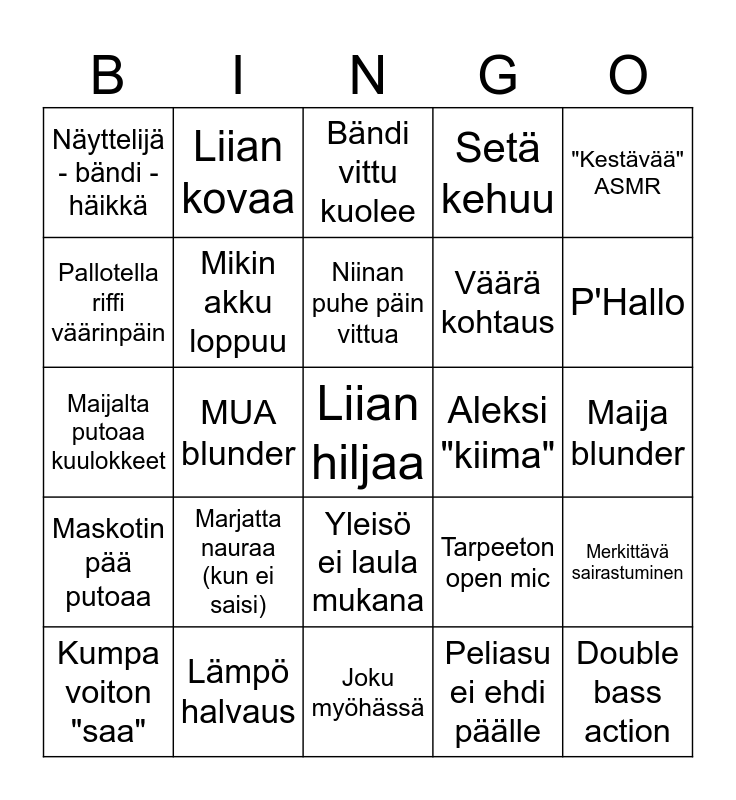 This bingo card has 25 words: Marjatta nauraa (kun ei saisi), Joku myöhässä, Niinan puhe päin vittua, Kumpa voiton "saa", "Kestävää" ASMR, Näyttelijä - bändi - häikkä, Pallotella riffi väärinpäin, Liian kovaa, Aleksi "kiima", Yleisö ei laula mukana, Väärä kohtaus, Maijalta putoaa kuulokkeet, Tarpeeton open mic, Merkittävä sairastuminen, Mikin akku loppuu, Double bass action, Maija blunder, Bändi vittu kuolee, P'Hallo, MUA blunder, Liian hiljaa, Lämpö halvaus, Maskotin pää putoaa, Setä kehuu and Peliasu ei ehdi päälle.