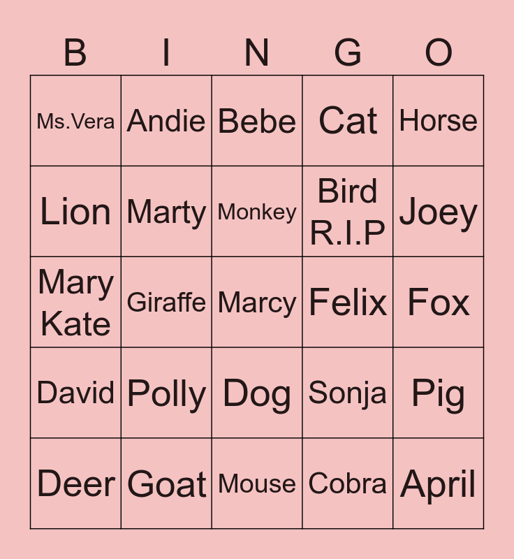 This bingo card has 35 words: Polar Bear, Lauren, Phyllis, Marty, Dog, Cat, Lion, Terry, Monkey, Angie, Mary Kate, Horse, Free!, Chicken, Ms.Vera, Felix, Cobra, Giraffe, David, Marcy, Sonja, Deer, Pig, Goat, Bebe, Joey, April, Jessica, Bird R.I.P, Fox, Racoon, Mouse, Polly, Andie and Zebra.
