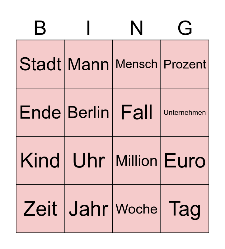 This bingo card has 16 words: Jahr, Euro, Mensch, Stadt, Kind, Mann, Million, Woche, Ende, Berlin, Zeit, Prozent, Uhr, Unternehmen, Fall and Tag.