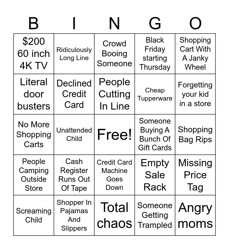 This bingo card has a free space and 32 words: Someone Getting Trampled, Shoppers Fighting Over Item, Unattended Child, Parking Lot Fender Bender, People Camping Outside Store, Declined Credit Card, Shopping Cart With A Janky Wheel, Missing Price Tag, Ridiculously Long Line, Shoplifters, People Cutting In Line, Crowd Booing Someone, Angry Store Worker, Annoying Christmas Music, Someone Buying A Bunch Of Gift Cards, Store Security Sensor Beeping, Screaming Child, No More Shopping Carts, Credit Card Machine Goes Down, Cash Register Runs Out Of Tape, Empty Sale Rack, Arms Full Of Items, Shopping Bag Rips, Shopper In Pajamas And Slippers, Angry moms, Black Friday starting Thursday, Cheap Tupperware, Literal door busters, $200 60 inch 4K TV, Total chaos, Local news crew at Walmart and Forgetting your kid in a store.