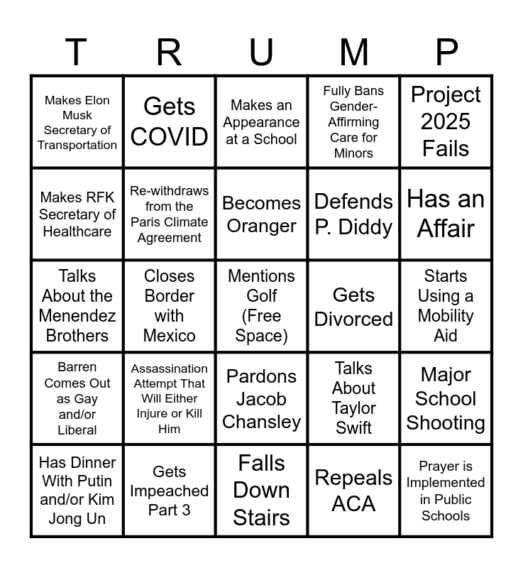 This bingo card has a free space and 24 words: Assassination Attempt That Will Either Injure or Kill Him, Gets Impeached Part 3, Becomes Oranger, Has Dinner With Putin and/or Kim Jong Un, Project 2025 Fails, Makes Elon Musk Secretary of Transportation, Makes RFK Secretary of Healthcare, Gets COVID, Gets Divorced, Pardons Jacob Chansley, Defends P. Diddy, Talks About the Menendez Brothers, Talks About Taylor Swift, Major School Shooting, Re-withdraws from the Paris Climate Agreement, Repeals ACA, Starts Using a Mobility Aid, Makes an Appearance at a School, Has an Affair, Closes Border with Mexico, Prayer is Implemented in Public Schools, Barren Comes Out as Gay and/or Liberal, Fully Bans Gender-Affirming Care for Minors and Falls Down Stairs.