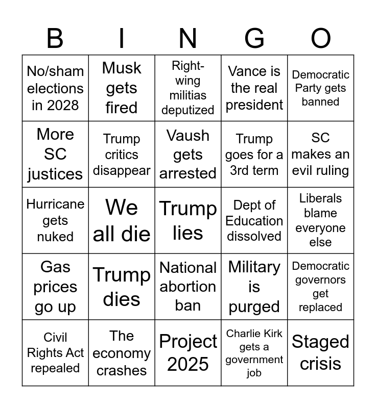 This bingo card has a free space and 24 words: Trump dies, The economy crashes, Vaush gets arrested, Civil Rights Act repealed, Democratic Party gets banned, No/sham elections in 2028, More SC justices, Musk gets fired, Dept of Education dissolved, National abortion ban, Trump goes for a 3rd term, Hurricane gets nuked, Military is purged, Democratic governors get replaced, Trump critics disappear, Charlie Kirk gets a government job, Liberals blame everyone else, Right-wing militias deputized, SC makes an evil ruling, We all die, Staged crisis, Gas prices go up, Vance is the real president and Project 2025.