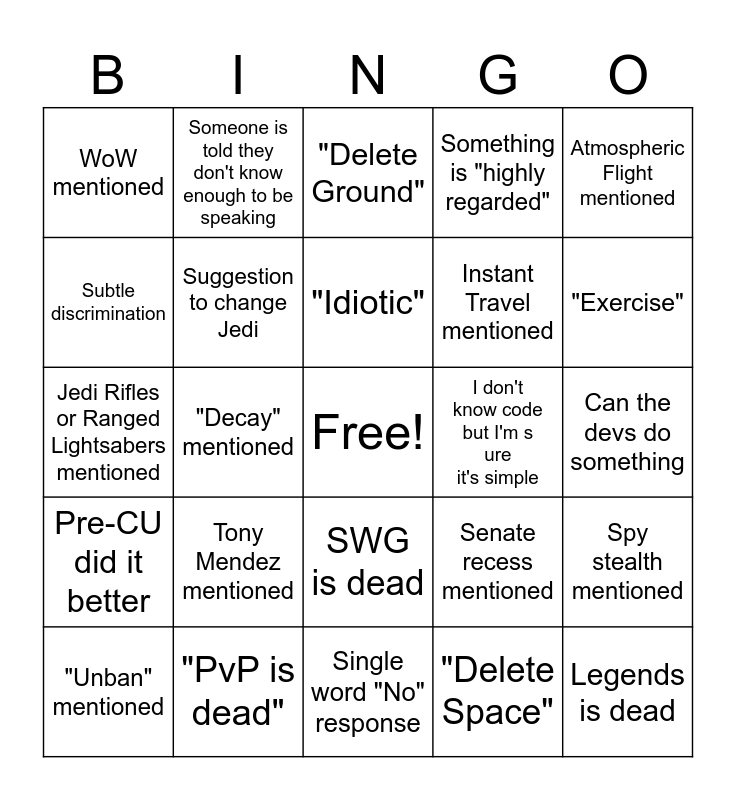 This bingo card has a free space and 29 words: "Unban" mentioned, Age of SWG mentioned, "Decay" mentioned, LF weaponsmith to cap x weapon, WoW mentioned, "Delete Ground", Suggestion to change Jedi, Tony Mendez mentioned, I don't know code but I'm sure it's simple, "PvP is dead", Can the devs do something, Legends is dead, Single word "No" response, "Delete Space", "Exercise", No trolling!, SWG is dead, Pre-CU did it better, Atmospheric Flight mentioned, Jedi Rifles or Ranged Lightsabers mentioned, Senate recess mentioned, "Beyond" mentioned, Instant Travel mentioned, Subtle discrimination, Something is "highly regarded", Someone is told they don't know enough to be speaking, Spy stealth mentioned, "Idiotic" and Exploiting mentioned.