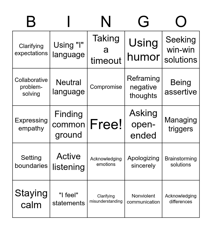 This bingo card has a free space and 24 words: Active listening, "I feel" statements, Compromise, Staying calm, Seeking win-win solutions, Clarifying expectations, Collaborative problem-solving, Using "I" language, Asking open-ended, Acknowledging emotions, Reframing negative thoughts, Expressing empathy, Apologizing sincerely, Brainstorming solutions, Neutral language, Nonviolent communication, Managing triggers, Taking a timeout, Being assertive, Finding common ground, Acknowledging differences, Setting boundaries, Using humor and Clarifying misunderstanding.