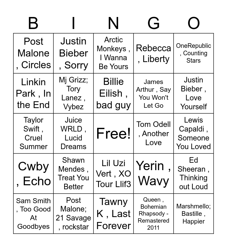 This bingo card has a free space and 100 words: The Weeknd , Blinding Lights, Ed Sheeran , Shape of You, Lewis Capaldi , Someone You Loved, Harry Styles , As It Was, Post Malone; Swae Lee , Sunflower - Spider-Man: Into the Spider-Verse, The Weeknd; Daft Punk , Starboy, Drake; Wizkid; Kyla , One Dance, The Kid LAROI; Justin Bieber , STAY (with Justin Bieber), The Neighbourhood , Sweater Weather, Imagine Dragons , Believer, Glass Animals , Heat Waves, Tones And I , Dance Monkey, Ed Sheeran , Perfect, Post Malone; 21 Savage , rockstar, The Hourglass Effect , Sunlight, Billie Eilish; Khalid , lovely (with Khalid), James Arthur , Say You Won't Let Go, The Chainsmokers; Halsey , Closer, Harry Styles , Watermelon Sugar, Shawn Mendes; Camila Cabello , Señorita, The Chainsmokers; Coldplay , Something Just Like This, leoleo , where do i go?, Vance Joy , Riptide, Dua Lipa , Don't Start Now, Hozier , Take Me To Church, Tom Odell , Another Love, OneRepublic , Counting Stars, Yerin , Wavy, Ed Sheeran , Photograph, Cwby , Like Em Country, Juice WRLD , Lucid Dreams, Post Malone , Circles, Melanie Herrera , Cool Girls Party, Drake , God's Plan, Queen , Bohemian Rhapsody - Remastered 2011, Billie Eilish , bad guy, Ed Sheeran , Thinking out Loud, Macklemore; Ryan Lewis; Macklemore & Ryan Lewis; Ray Dalton , Can't Hold Us (feat. Ray Dalton), Vlade Kay , Joyride, Coldplay , Yellow, Travis Scott , goosebumps, Lady Gaga; Bradley Cooper , Shallow, Taylor Swift , Cruel Summer, Draknip , Leaving, Justin Bieber , Love Yourself, Arctic Monkeys , I Wanna Be Yours, Imagine Dragons , Thunder, John Legend , All of Me, Lord Huron , The Night We Met, Tawny K , Last Forever, The Weeknd , Die For You, Avicii , Wake Me Up - Radio Edit, Imagine Dragons , Demons, The Weeknd , The Hills, Zenon Z'Adore; Ghost Angel , If Tomorrow Never Comes Radio Edit, Twenty One Pilots , Stressed Out, Coldplay , Viva La Vida, J. Cole , No Role Modelz, Kendrick Lamar , HUMBLE., Rebecca , Liberty, Passenger , Let Her Go, Ariana Grande , 7 rings, The Killers , Mr. Brightside, Eminem , Without Me, Eminem , Lose Yourself, Bruno Mars , When I Was Your Man, Arctic Monkeys , Do I Wanna Know?, Bruno Mars , Just the Way You Are, Olivia Rodrigo , drivers license, XANDi , Just Like That, Calvin Harris; Dua Lipa , One Kiss (with Dua Lipa), Shawn Mendes , Treat You Better, Olivia Rodrigo , good 4 u, XXXTENTACION , SAD!, DJ Snake; Justin Bieber , Let Me Love You, French Montana; Swae Lee , Unforgettable, Miley Cyrus , Flowers, Linkin Park , In the End, XXXTENTACION , Jocelyn Flores, The Police , Every Breath You Take, Bruno Mars , That's What I Like, Marshmello; Bastille , Happier, Bruno Mars , Locked out of Heaven, Lil Uzi Vert , XO Tour Llif3, Travis Scott , SICKO MODE, Justin Bieber , Sorry, Major Lazer; MØ; DJ Snake , Lean On (feat. MØ & DJ Snake), Dua Lipa , New Rules, Shawn Mendes , There's Nothing Holdin' Me Back, Cwby , Echo, Dua Lipa; DaBaby , Levitating (feat. DaBaby), Nirvana , Smells Like Teen Spirit, Elton John; Dua Lipa; PNAU , Cold Heart - PNAU Remix, Sam Smith , Too Good At Goodbyes, Mj Grizz; Tory Lanez , Vybez, Sam Smith , Stay With Me, SZA , Kill Bill, Equatoriale; Kingo Halla , Hotel, Camila Cabello; Young Thug , Havana (feat. Young Thug) and Oasis , Wonderwall.
