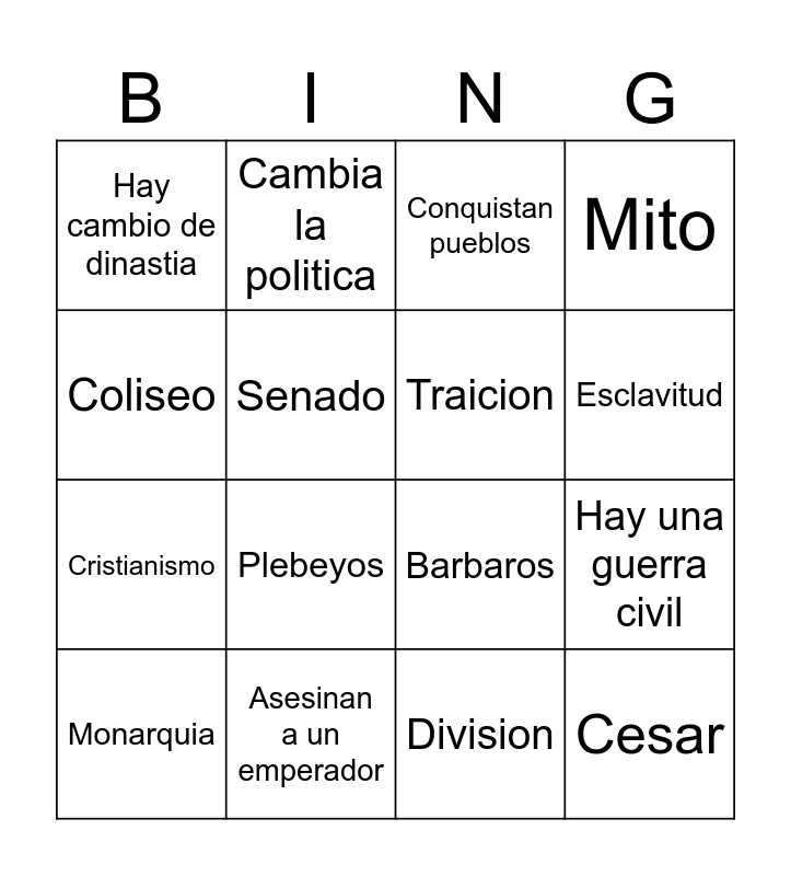 This bingo card has 16 words: Asesinan a un emperador, Hay una guerra civil, Conquistan pueblos, Hay cambio de dinastia, Cristianismo, Cambia la politica, Barbaros, Division, Coliseo, Senado, Monarquia, Mito, Plebeyos, Esclavitud, Traicion and Cesar.
