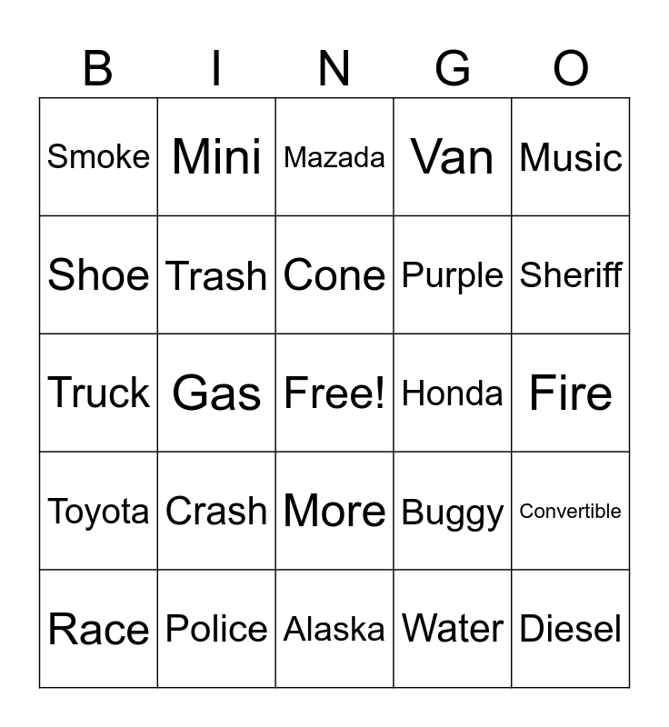 This bingo card has a free space and 27 words: Buggy, CyberTruck, Purple, Alaska, Shoe, Mazada, Mini, Toyota, Honda, Convertible, Truck, Van, Race, Police, Sheriff, Motorcycle, Trash, Cone, Crash, Smoke, Fire, Water, Gas, Diesel, More, Music and Gaming.