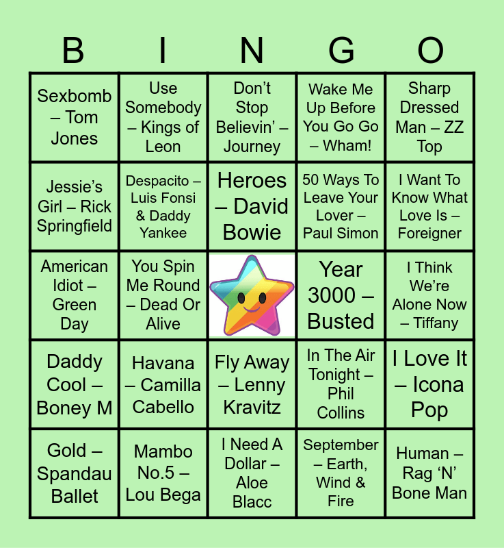 This bingo card has a free space and 75 words: Never Gonna Give You Up - Rick Astley, Forget You – CeeLo Green, Don’t Stop Believin’ – Journey, Celebration – Kool & The Gang, Bad Day – Daniel Powter, Hooked On A Feeling – Blue Swede, We Didn’t Start The Fire – Billy Joel, Baby Got Back – Sir Mix-A-Lot, Wrecking Ball – Miley Cyrus, Moves Like Jagger – Maroon 5, Hit Me With Your Best Shot – Pat Benatar, Happy – Pharrell Williams, Heroes – David Bowie, Jessie’s Girl – Rick Springfield, Intergalatic – Beastie Boys, You Spin Me Round – Dead Or Alive, Cherry Pie – Warrant, Human – Rag ‘N’ Bone Man, Kickstart My Heart – Motley Crue, Sharp Dressed Man – ZZ Top, Creep – Radiohead, American Idiot – Green Day, Despacito – Luis Fonsi & Daddy Yankee, Use Somebody – Kings of Leon, Wake Me Up Before You Go Go – Wham!, It Wasn’t Me – Shaggy, Maggie May – Rod Stewart, Tubthumping – Chumbawamba, How Bizarre – OMC, Jump Around – How Of Pain, Total Eclipse Of The Heart – Bonnie Tyler, Hot In Here – Nelly, I Try – Macy Gray, In The Air Tonight – Phil Collins, I Want To Know What Love Is – Foreigner, 50 Ways To Leave Your Lover – Paul Simon, Immigrant Song – Led Zeppelin, Ho Hey – The Lumineers, I Think We’re Alone Now – Tiffany, September – Earth, Wind & Fire, Single Ladies – Beyonce, It’s Raining Men – The Weather Girls, Crazy – Gnarls Barkley, Purple Rain – Prince, Let Me Entertain You – Robbie Williams, Somebody That I Used To Know – Gotye, Gold – Spandau Ballet, Sexbomb – Tom Jones, Mamma Mia – ABBA, Call On Me – Eric Prydz, Back To Black – Amy Winehouse, Fly Away – Lenny Kravitz, Bye Bye Bye – NSYNC, Save Tonight – Eagle Eye Cherry, Getting Jiggy With It – Will Smith, Push It – Salt-N-Pepa, Little Lion Man – Mumford & Sons, Fireflies – Owl City, You’ve Got The Love – Florence & The Machine, A Thousand Miles – Vanessa Carlton, Havana – Camilla Cabello, Ain’t No Mountain High Enough – Marvin Gaye, Every Time We Touch – Cascada, Funkytown – Lipps Inc., Should I Stay Or Should I Go – The Clash, Year 3000 – Busted, Teenage Dirtbag – Wheatus, Stacy’s Mom – Fountains Of Wayne, Call Me Maybe – Carly Rae Jepsen, I Love It – Icona Pop, Daddy Cool – Boney M, Mambo No.5 – Lou Bega, All About That Base – Meghan Trainor, I Need A Dollar – Aloe Blacc and Heaven Is A Place On Earth – Belinda Carlisle.