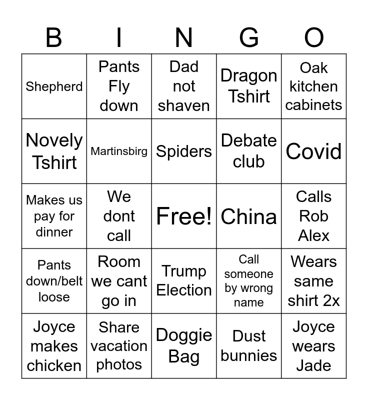 This bingo card has a free space and 24 words: Room we cant go in, Share vacation photos, Spiders, Joyce makes chicken, Oak kitchen cabinets, Shepherd, Novely Tshirt, Pants Fly down, China, Trump Election, Debate club, Makes us pay for dinner, Call someone by wrong name, Wears same shirt 2x, Martinsbirg, Dust bunnies, Calls Rob Alex, Dad not shaven, Covid, We dont call, Joyce wears Jade, Pants down/belt loose, Dragon Tshirt and Doggie Bag.