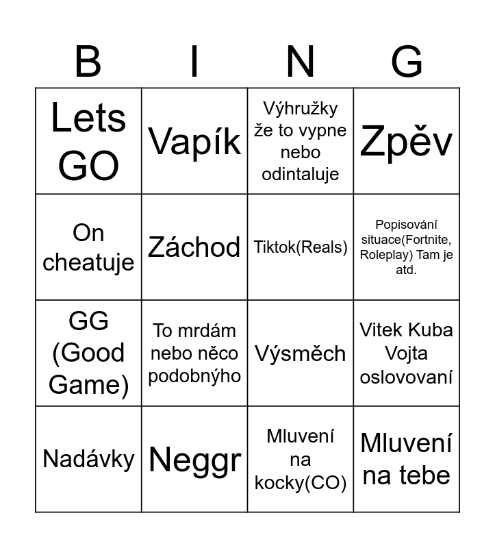 This bingo card has 16 words: Neggr, Vitek Kuba Vojta oslovovaní, Výhružky že to vypne nebo odintaluje, Lets GO, GG (Good Game), Vapík, Výsměch, Mluvení na kocky(CO), On cheatuje, Záchod, Nadávky, Zpěv, To mrdám nebo něco podobnýho, Popisování situace(Fortnite, Roleplay) Tam je atd., Tiktok(Reals) and Mluvení na tebe.