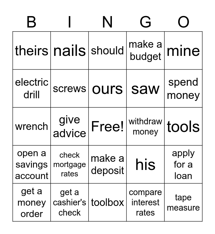 This bingo card has a free space and 34 words: hammer, ladder, screwdriver, plunger, tools, electric drill, screws, toolbox, saw, tape measure, wrench, nails, compare interest rates, open a checking account, open a savings account, give advice, make a deposit, withdraw money, apply for a loan, get a money order, get a cashier's check, transfer money, make a budget, spend money, save money, check mortgage rates, should, shouldn't, mine, theirs, yours, ours, his and hers.