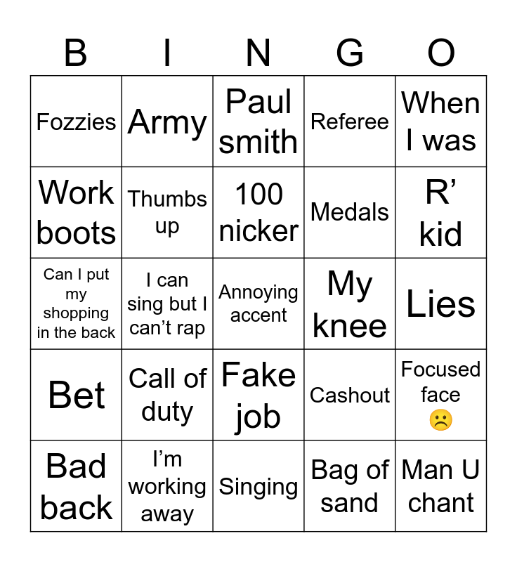 This bingo card has a free space and 26 words: Fake job, Bag of sand, 100 nicker, I’m working away, When I was, Fozzies, Work boots, Army, Lies, Cashout, Medals, Can I put my shopping in the back, Focused face ☹️, Bad back, I can sing but I can’t rap, Over 10 pints, Referee, Bet, Paul smith, Man U chant, R’ kid, Singing, My knee, Call of duty, Thumbs up and Wink.