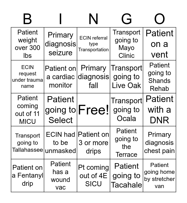 This bingo card has a free space and 24 words: ECIN had to be unmasked, Patient has a wound vac, Primary diagnosis fall, Patient on a Fentanyl drip, Patient on a vent, Patient weight over 300 lbs, ECIN request under trauma name, Primary diagnosis seizure, Transport going to Ocala, Patient on 3 or more drips, Transport going to Live Oak, Patient coming out of 11 MICU, Patient going to the Terrace, Primary diagnosis chest pain, Patient on a cardiac monitor, Patient going to Tacahale, Patient with a DNR, ECIN referral type Transportation, Patient going to Shands Rehab, Patient going to Select, Patient going home by stretcher van, Transport going to Tallahassee, Transport going to Mayo Clinic and Pt coming out of 4E SICU.