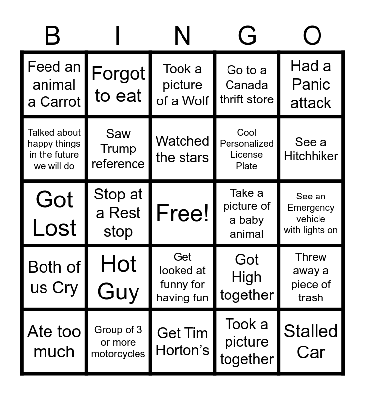 This bingo card has a free space and 24 words: Hot Guy, Group of 3 or more motorcycles, Watched the stars, Ate too much, Had a Panic attack, Feed an animal a Carrot, Talked about happy things in the future we will do, Forgot to eat, Take a picture of a baby animal, Get looked at funny for having fun, Cool Personalized License Plate, Got Lost, Got High together, Threw away a piece of trash, Saw Trump reference, Took a picture together, See an Emergency vehicle with lights on, Took a picture of a Wolf, See a Hitchhiker, Stop at a Rest stop, Stalled Car, Both of us Cry, Go to a Canada thrift store and Get Tim Horton’s.