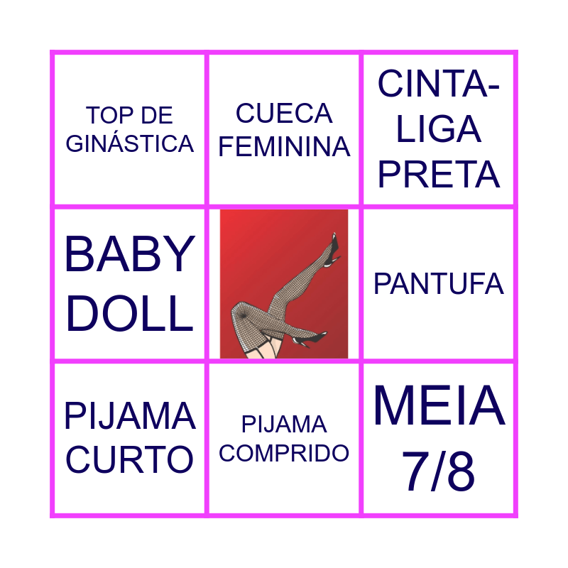 This bingo card has a free space and 41 words: CALCINHA DE RENDA, MEIA-CALÇA BEGE, CALCINHA DE ALGODÃO, PIJAMA CURTO, CAMISOLA, SUTIÃ PRETO, PIJAMA COMPRIDO, BRINQUEDO ERÓTICO, MEIA 7/8, ESPARTILHO PRETO, SUTIÃ VERMELHO, BABY DOLL, MEIAS COLORIDAS, CONJUNTO CALCINHA/SUTIÃ, SUTIÃ BRANCO, FANTASIA SEXUAL, CALCINHA FIO DENTAL, TOP DE GINÁSTICA, ROUPÃO, CINTA-LIGA PRETA, MASCARA DE DORMIR, LUVAS, CINTA-LIGA VERMELHA, MEIA-CALÇA PRETA, MEIA-CALÇA ARRASTÃO, ESPARTILHO VERMELHO, MEIA-CALÇA BEGE, CINTA-LIGA BRANCA, ESPARTILHO BRANCO, CAMISETÃO DE DORMIR, ÓLEO DE MASSAGEM, CUECA FEMININA, BIQUÍNI, MEIAS BRANCAS, CHINELO, PANTUFA, SUTIÃ BEGE, TOUCA DE BANHO, PORTA- SUTIÃ, MEIA 3/4 BEGE and MEIA 3/4 PRETA.