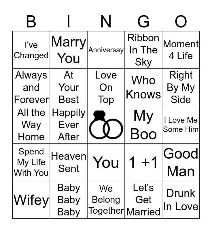 This bingo card has a free space and 24 words: Heaven Sent, Baby Baby Baby, Love On Top, Wifey, Moment 4 Life, I've Changed, Always and Forever, Marry You, My Boo, You, Who Knows, All the Way Home, 1 +1, Good Man, At Your Best, Let's Get Married, I Love Me Some Him, Anniversay, Right By My Side, Happily Ever After, Drunk In Love, Spend My Life With You, Ribbon In The Sky and We Belong Together.