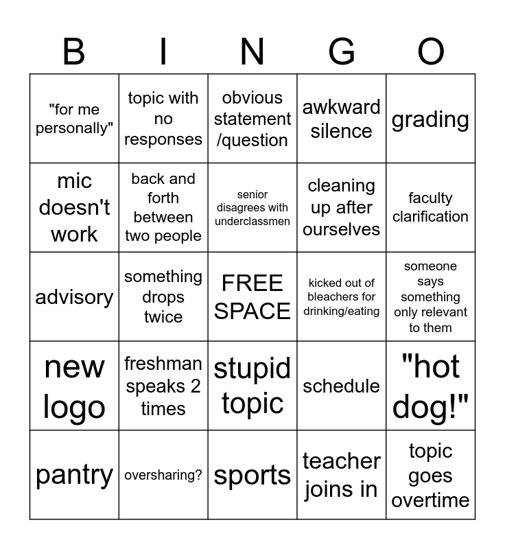 This bingo card has a free space and 29 words: pantry, passive aggression, something drops twice, parking, "for me personally", obvious statement /question, back and forth between two people, freshman speaks 2 times, kicked out of bleachers for drinking/eating, oversharing?, someone says something only relevant to them, topic goes overtime, sports, teacher joins in, faculty clarification, Matt joins in, stupid topic, new logo, grading, advisory, schedule, identity groups, cleaning up after ourselves, mic doesn't work, awkward silence, topic with no responses, "hot dog!", senior disagrees with underclassmen and phone policy.