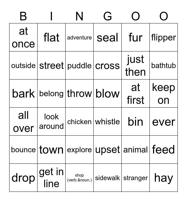 This bingo card has 38 words: feed, animal, hay, outside, look around, at first, street, stranger, fur, puddle, bathtub, seal, bark, throw, flipper, blow, explore, adventure, get in line, belong, at once, whistle, cross, chicken, shop (verb.&noun.), bin, bounce, sidewalk, drop, upset, truck, keep on, ever, flat, town, all over, just then and always.
