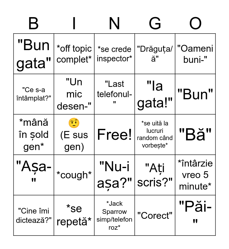This bingo card has a free space and 24 words: *cough*, *se repetă*, "Last telefonul-", "Cine îmi dictează?", "Oameni buni-", "Bun gata", "Ce s-a întâmplat?", *off topic complet*, *se uită la lucruri random când vorbește*, "Nu-i așa?", "Ia gata!", *mână în șold gen*, "Ați scris?", *întârzie vreo 5 minute*, "Un mic desen-", "Corect", "Bă", *se crede inspector*, "Bun", 🤨 (E sus gen), "Păi-", "Așa-", "Drăguța/ă" and *Jack Sparrow simp/telefon roz*.