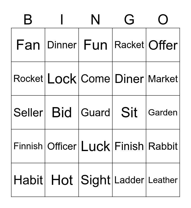 This bingo card has 30 words: Hot, Hut, Bid, Bed, Fan, Fun, Lock, Luck, Sit, Sight, Garden, Guard, Ladder, Leather, Market, Marked, Finish, Finnish, Officer, Offer, Seller, Sailor, Dinner, Diner, Rocket, Racket, Rabbit, Habit, Come and Comb.
