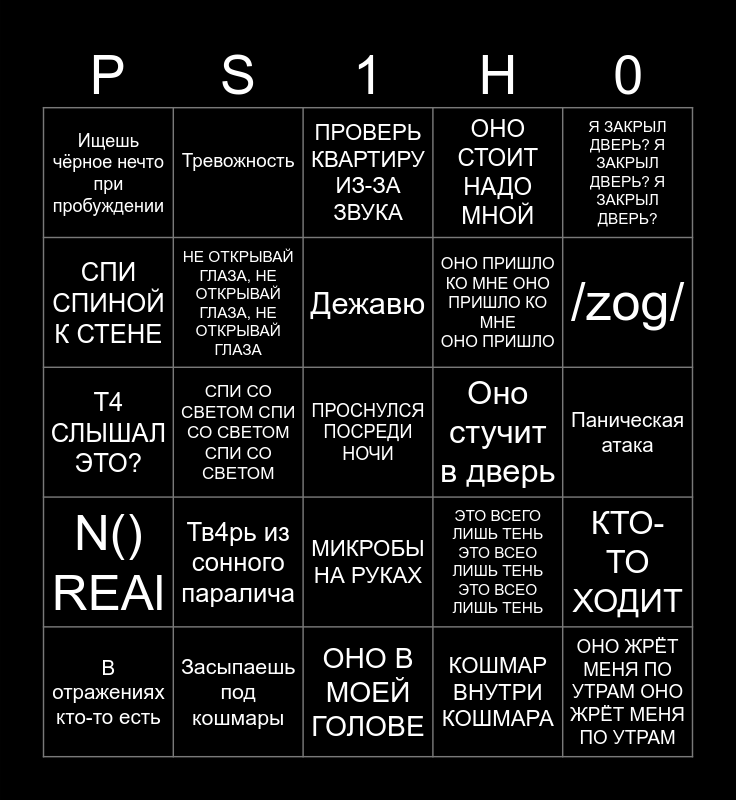 This bingo card has a free space and 24 words: Тв4рь из сонного паралича, Засыпаешь под кошмары, Дежавю, В отражениях кто-то есть, Я ЗАКРЫЛ ДВЕРЬ? Я ЗАКРЫЛ ДВЕРЬ? Я ЗАКРЫЛ ДВЕРЬ?, Ищешь чёрное нечто при пробуждении, СПИ СПИНОЙ К СТЕНЕ, Тревожность, Оно стучит в дверь, МИКРОБЫ НА РУКАХ, ОНО ПРИШЛО КО МНЕ ОНО ПРИШЛО КО МНЕ ОНО ПРИШЛО, Т4 СЛЫШАЛ ЭТО?, ЭТО ВСЕГО ЛИШЬ ТЕНЬ ЭТО ВСЕО ЛИШЬ ТЕНЬ ЭТО ВСЕО ЛИШЬ ТЕНЬ, КТО-ТО ХОДИТ, НЕ ОТКРЫВАЙ ГЛАЗА, НЕ ОТКРЫВАЙ ГЛАЗА, НЕ ОТКРЫВАЙ ГЛАЗА, КОШМАР ВНУТРИ КОШМАРА, Паническая атака, ПРОВЕРЬ КВАРТИРУ ИЗ-ЗА ЗВУКА, /zog/, СПИ СО СВЕТОМ СПИ СО СВЕТОМ СПИ СО СВЕТОМ, ОНО ЖРЁТ МЕНЯ ПО УТРАМ ОНО ЖРЁТ МЕНЯ ПО УТРАМ, N() REAl, ОНО СТОИТ НАДО МНОЙ and ОНО В МОЕЙ ГОЛОВЕ.