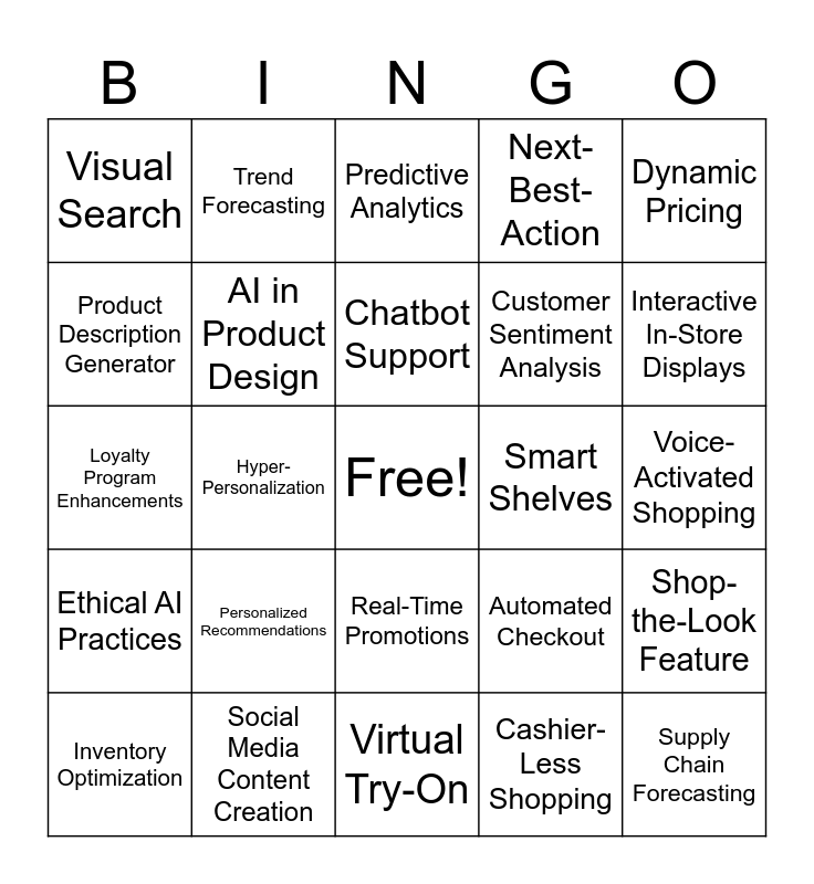 This bingo card has a free space and 25 words: Personalized Recommendations, Virtual Try-On, Chatbot Support, Inventory Optimization, Dynamic Pricing, Visual Search, Product Description Generator, Trend Forecasting, Smart Shelves, Real-Time Promotions, Customer Sentiment Analysis, Loyalty Program Enhancements, Automated Checkout, Shop-the-Look Feature, AI in Product Design, Cross-Selling Suggestions, Voice-Activated Shopping, Predictive Analytics, Interactive In-Store Displays, Hyper-Personalization, Supply Chain Forecasting, Social Media Content Creation, Ethical AI Practices, Next-Best-Action and Cashier-Less Shopping.