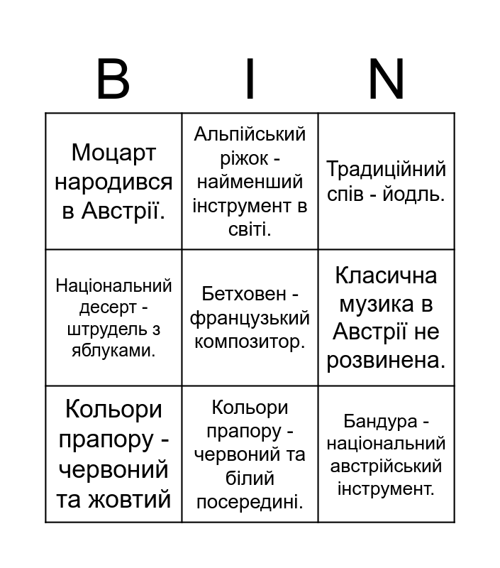 This bingo card has 9 words: Кольори прапору - червоний та жовтий, Традиційний спів - йодль., Альпійський ріжок - найменший інструмент в світі., Національний десерт - штрудель з яблуками., Моцарт народився в Австрії., Класична музика в Австрії не розвинена., Бетховен - французький композитор., Бандура - національний австрійський інструмент. and Кольори прапору - червоний та білий посередині..