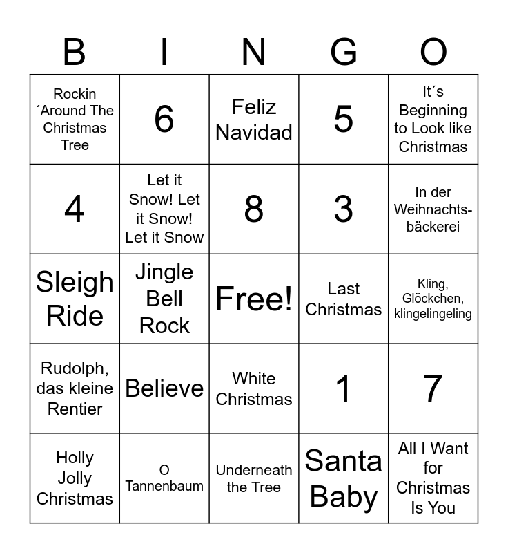 This bingo card has a free space and 29 words: Holly Jolly Christmas, Lass jetzt los, Jingle Bell Rock, The Nutcracker, Rockin´Around The Christmas Tree, Feliz Navidad, Let it Snow! Let it Snow! Let it Snow, Believe, Last Christmas, O Tannenbaum, Kling, Glöckchen, klingelingeling, All I Want for Christmas Is You, Underneath the Tree, Santa Baby, In der Weihnachts-bäckerei, Weihnachtsmann & Co. KG, White Christmas, Rudolph, das kleine Rentier, It´s Beginning to Look like Christmas, Sleigh Ride, 1, 2, 3, 4, 5, 6, 7, 8 and 9.