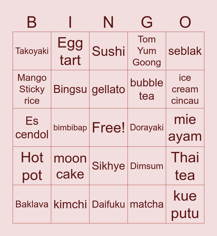 This bingo card has a free space and 30 words: kimchi, 1Phad Thai, bimbibap, ramyeon, Takoyaki, Sushi, Bingsu, Sikhye, Dorayaki, Daifuku, mie ayam, kue putu, matcha, sake, ice cream cincau, Telur gulung, Dimsum, Hot pot, moon cake, seblak, Es cendol, Shom Tum, Egg tart, bubble tea, Mango Sticky rice, Tom Yum Goong, Thai tea, Baklava, gellato and Pizza.