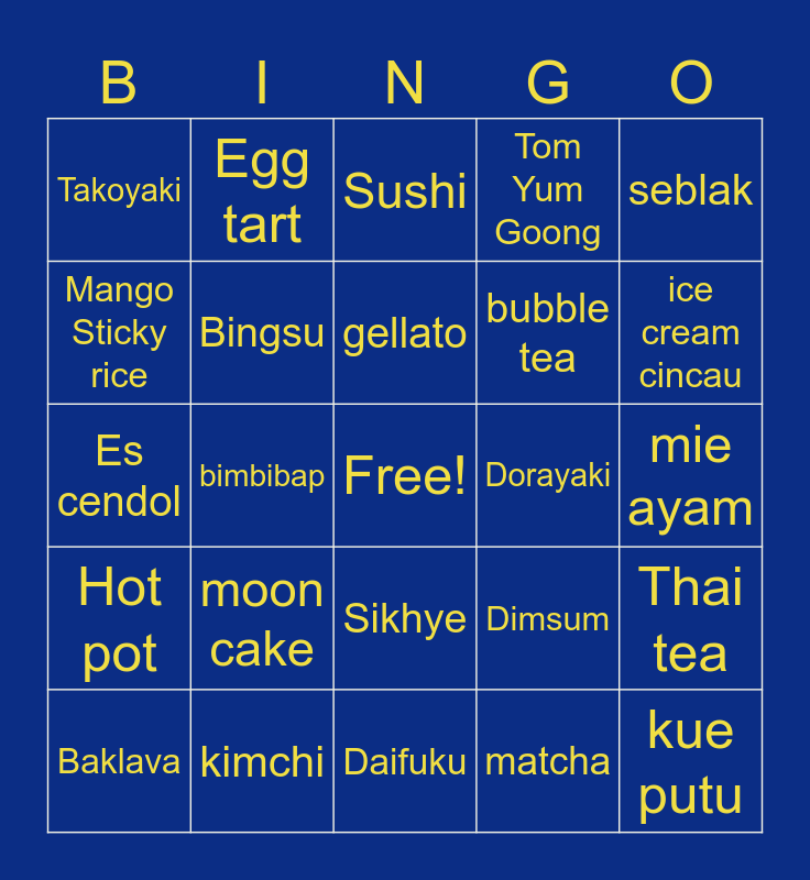 This bingo card has a free space and 30 words: kimchi, 1Phad Thai, bimbibap, ramyeon, Takoyaki, Sushi, Bingsu, Sikhye, Dorayaki, Daifuku, mie ayam, kue putu, matcha, sake, ice cream cincau, Telur gulung, Dimsum, Hot pot, moon cake, seblak, Es cendol, Shom Tum, Egg tart, bubble tea, Mango Sticky rice, Tom Yum Goong, Thai tea, Baklava, gellato and Pizza.