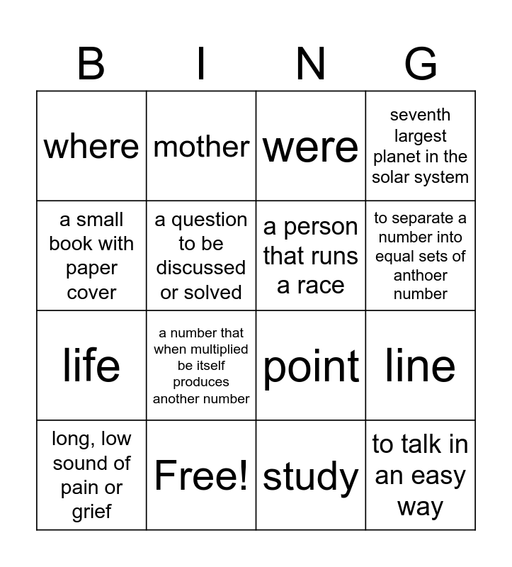 This bingo card has 16 words: Free!, line, were, where, life, mother, point, study, a small book with paper cover, a question to be discussed or solved, long, low sound of pain or grief, seventh largest planet in the solar system, a number that when multiplied be itself produces another number, to separate a number into equal sets of anthoer number, a person that runs a race and to talk in an easy way.