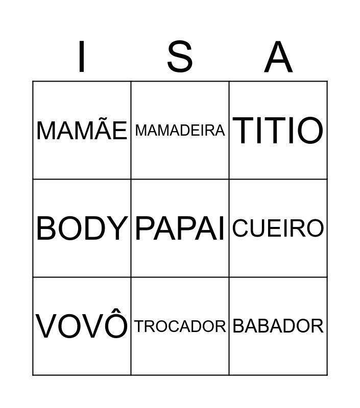 This bingo card has 24 words: BANHEIRA, FRALDA, TROCADOR, CHUPETA, PAPAI, MAMÃE, CUEIRO, MAMADEIRA, CHOCALHO, MACACÃO, BABADOR, PAPINHA, CHUQUINHA, MORDEDOR, VOVÔ, VOVÓ, TITIA, TITIO, POMADA, LUVINHA, SAPATINHO, COBERTOR, BODY and LENÇO UMEDECIDO.