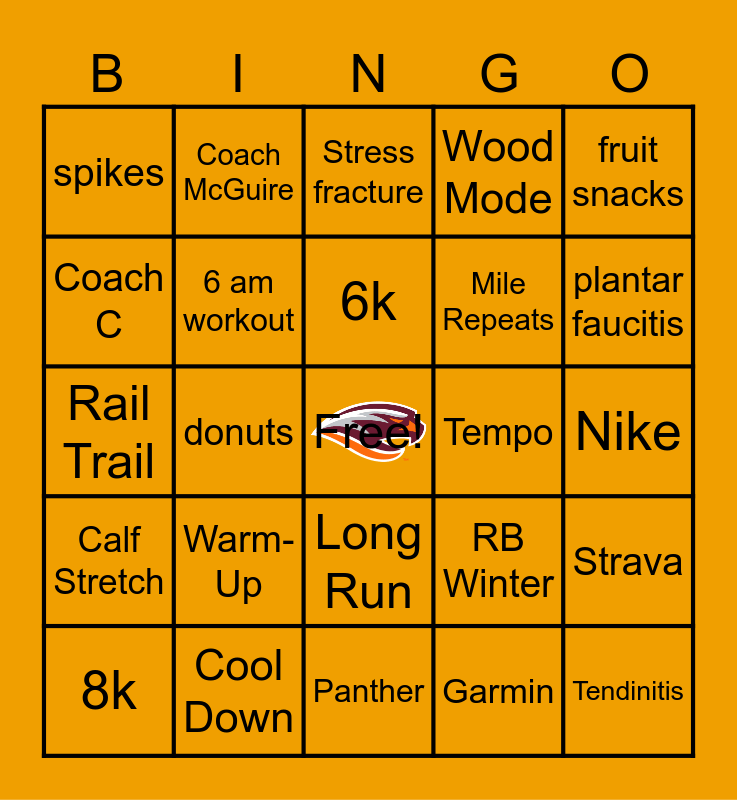This bingo card has a free space and 24 words: Warm-Up, Cool Down, 6k, 8k, fruit snacks, spikes, Coach C, Coach McGuire, Tempo, Long Run, Mile Repeats, Rail Trail, RB Winter, Strava, 6 am workout, Garmin, Nike, Stress fracture, plantar faucitis, donuts, Tendinitis, Calf Stretch, Wood Mode and Panther.