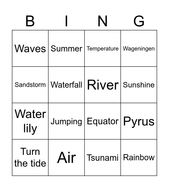 This bingo card has 32 words: Mountains, Ocean, Pyrus, Rain, Rainbow, River, Sandstorm, Soil, Summer, Sunset, Sunshine, Temperature, Thunder, lava, Air, Avalanche, Beach, Equator, Fire, Heat Waves, Hurricane, Tides, Tsunami, Turbulence, Turn the tide, Wageningen, Water lily, Waterfall, Waves, Wind, Ice and Jumping.